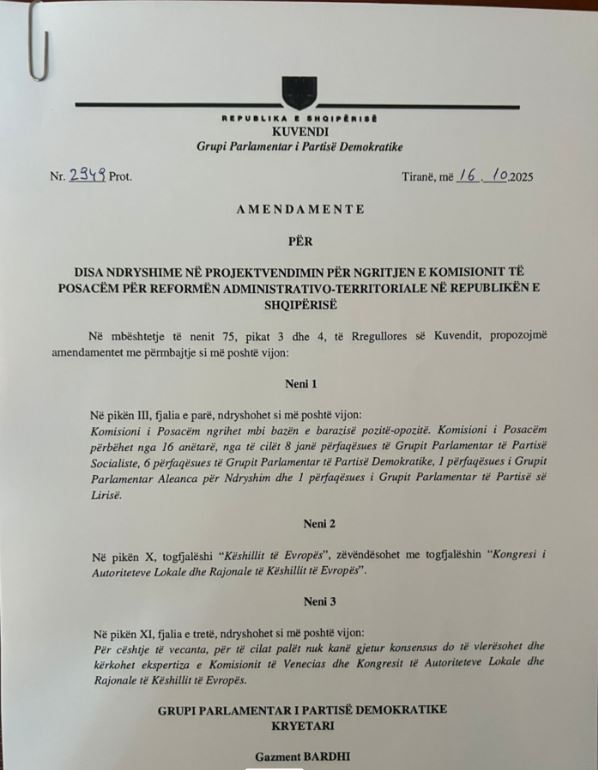 Janë zbardhur sot, 16 tetor, amendamentet e Partisë Demokratike për projektvendimin e ngritjes së Komisionit të Posaçëm për Reformën Zgjedhore dhe atë për Reformën Territoriale.